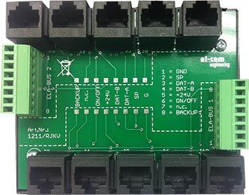 Modul zum Anschluss und Verteilungen von zwei Leitungen an den ELA-Bus. Die beiden Anschlüsse sind komplett voneinander getrennt. Je Bus sind einzelne Messpunkte vorgesehen.